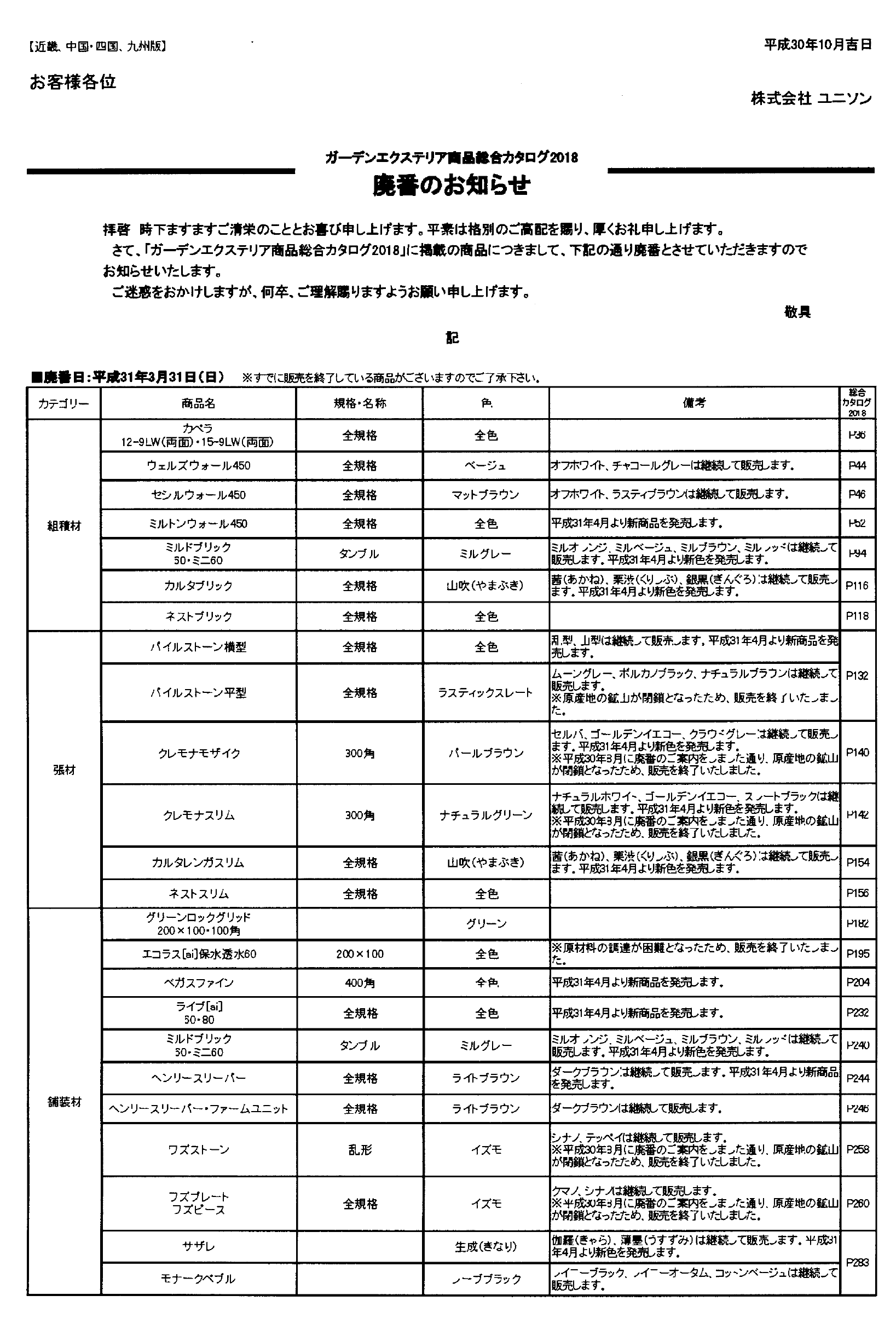 2019年3月末 ユニソン製品 販売商品について