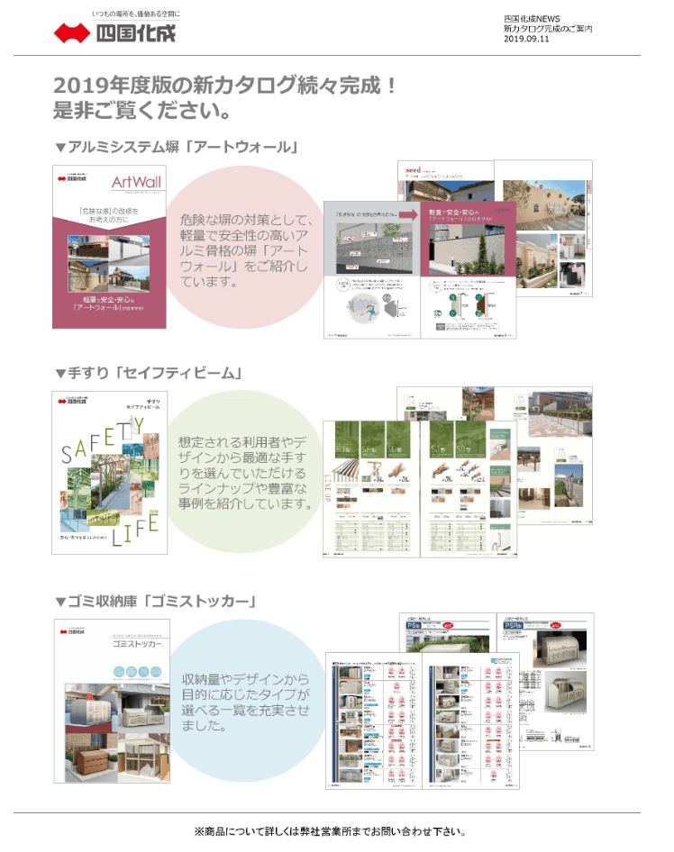 四国化成NEWS/最新カタログ続々発行! 2019年09月13日 四国化成カタログをご希望の方は、 1 ご希望のカタログ名 2 お届け先(郵便番号 住所 電話番号 お名前) を教えて頂けましたら、手配をさせて頂きます。 パソコンやスマートホンでご覧になって頂けるデジタルカタログは、 http://download.shikoku.co.jp/iportal/ をご覧ください。 Tweet Facebookコメント «前 次» What's New