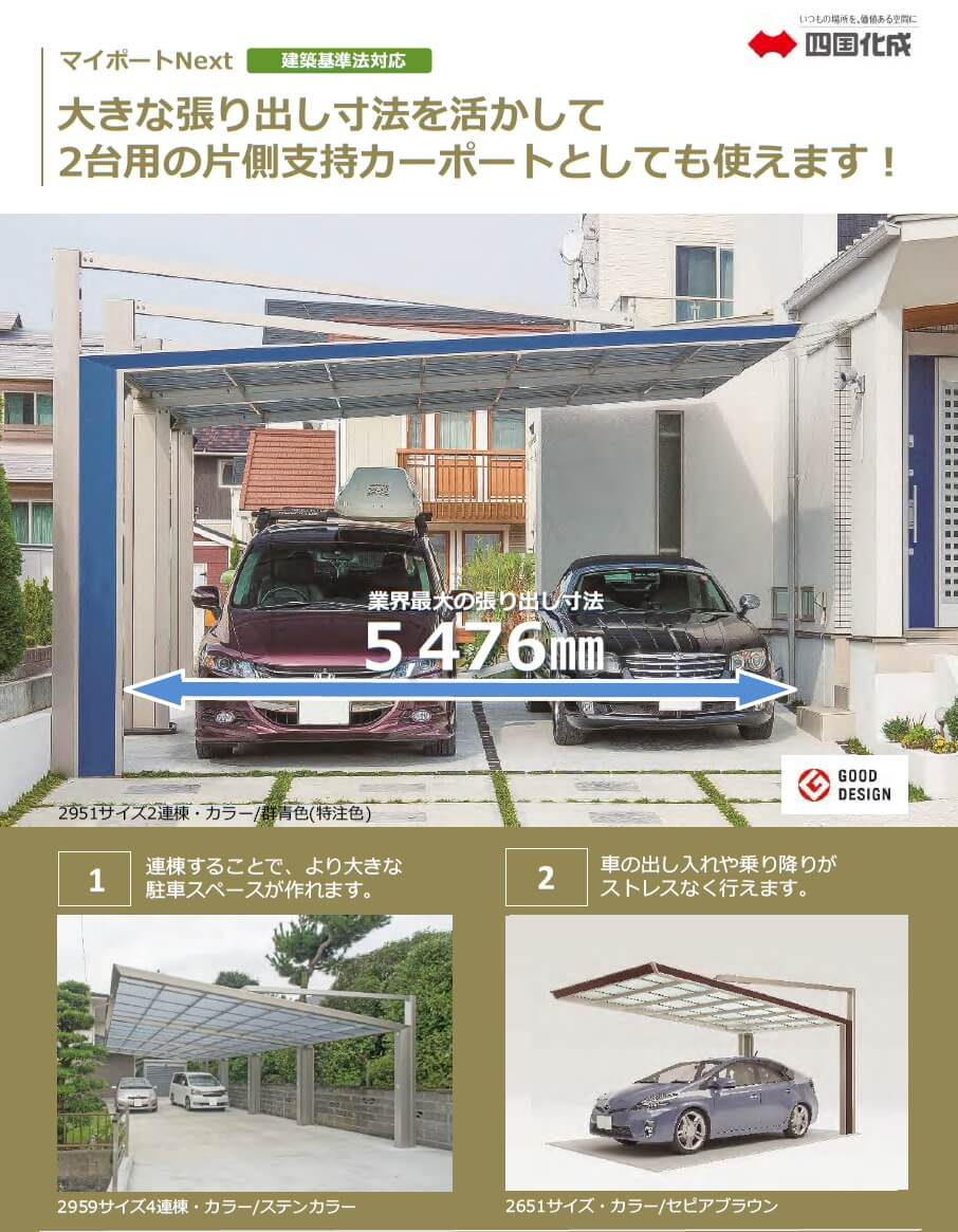 2台並列駐車に対応したワイドタイプの片側支持カーポートとしても
