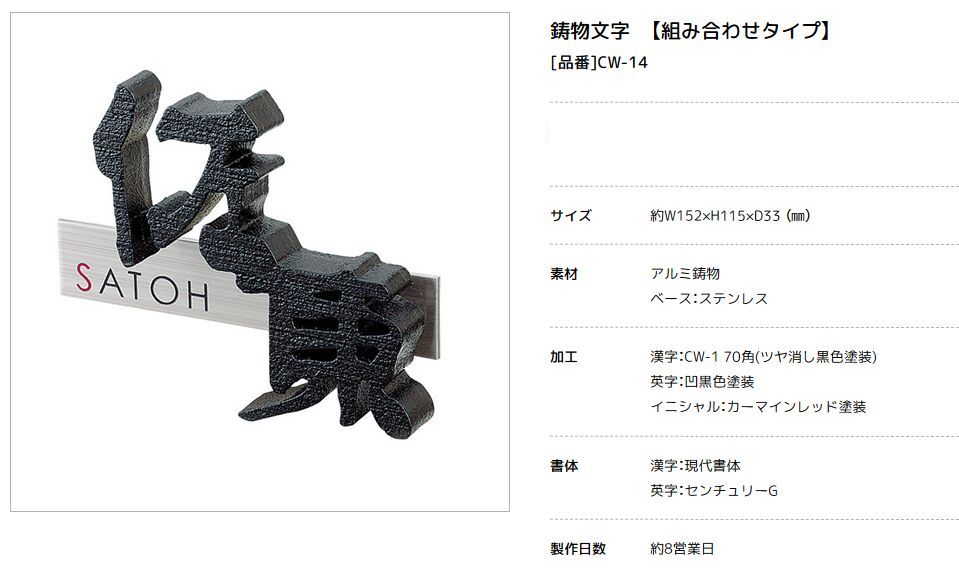 美濃クラフト CW-14 鋳物文字 組み合わせタイプ アルミ鋳物表札(鋳物文字2文字あたりのお値段です)