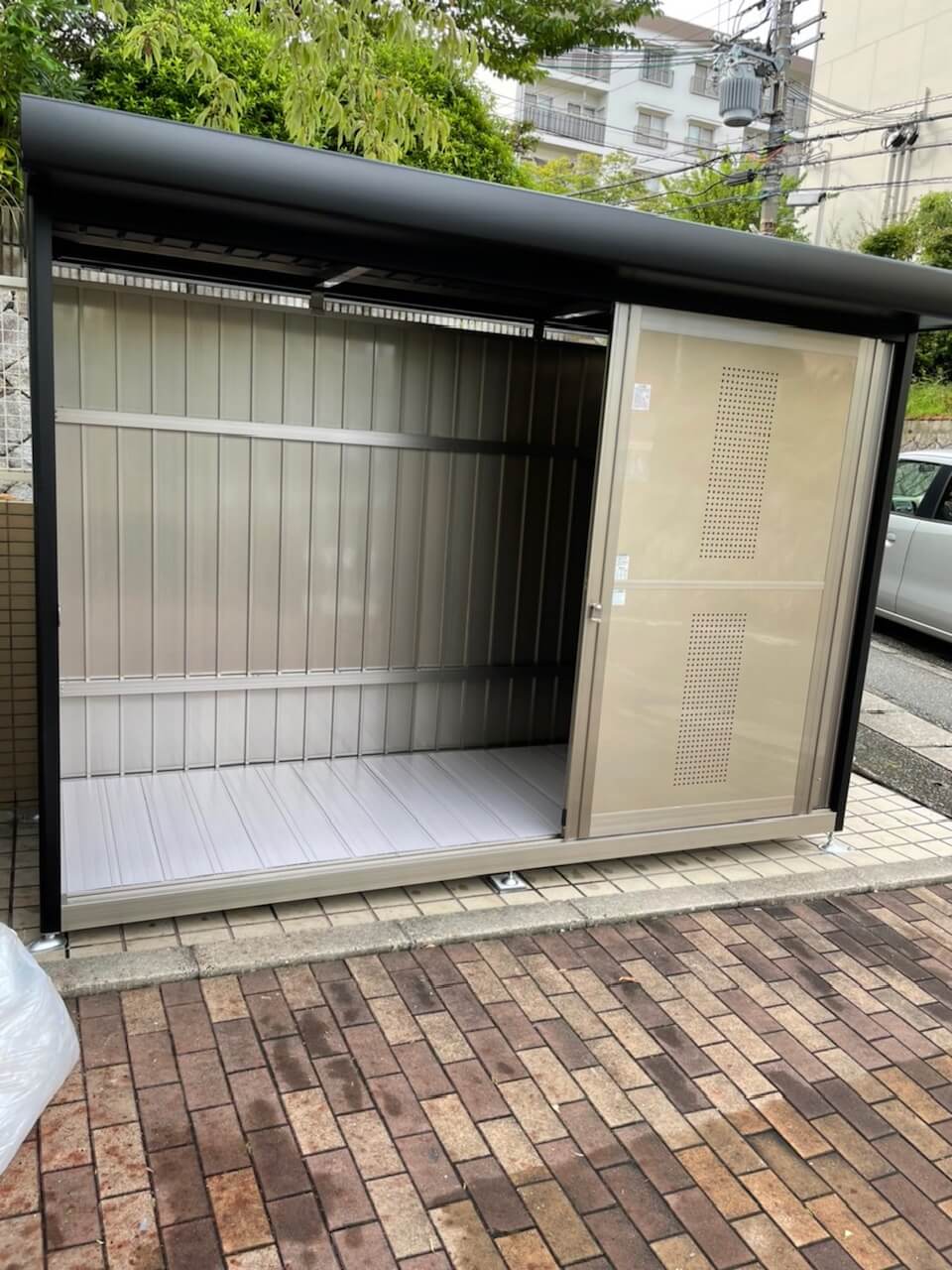 「物置代わりにもなる、施工が簡単な床付きタイプの大型屋外用ゴミ箱です」