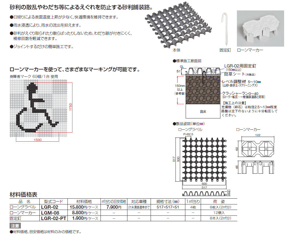 ◎車の走行や、人の歩行による砂利の移動を抑え、補修・管理費を削減します。