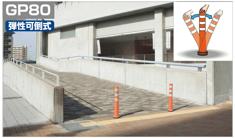◎車が当たると曲がり、損傷を最小限にくい止めます。