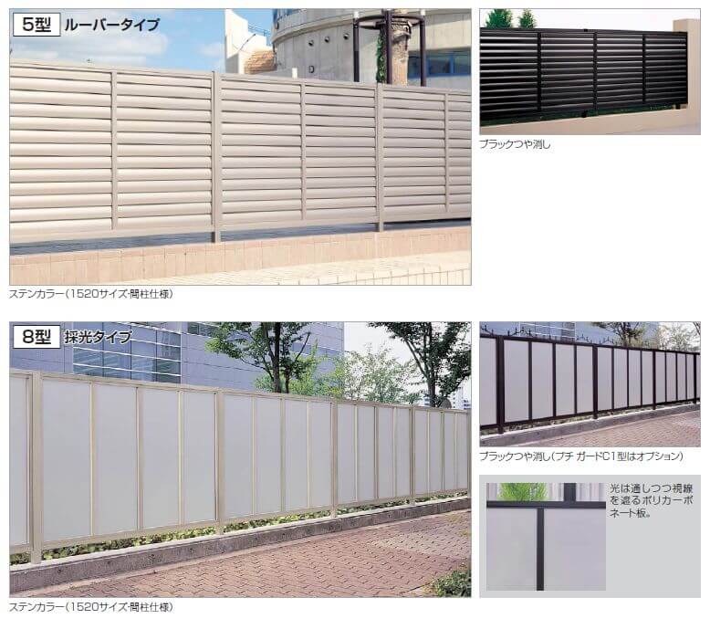 「横ルーバーの5型 採光タイプの8型 様々な形の大型フェンスです」