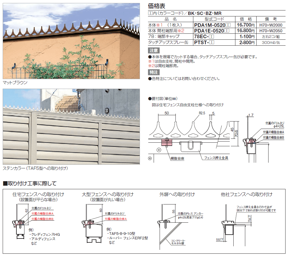 「耐久性に優れたアルミ形材を使用した、視覚的に防犯効果のあるデザインの忍び返し」です。