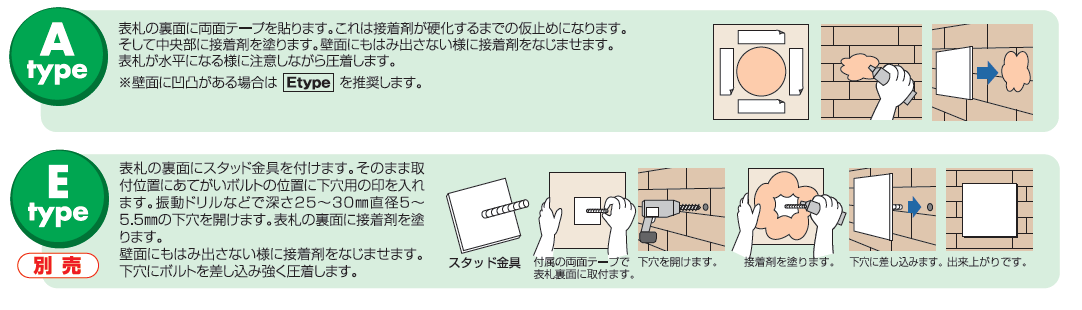 ・Eタイプ(凸凹がある壁の場合) 接着剤+スタッド金具で取り付け