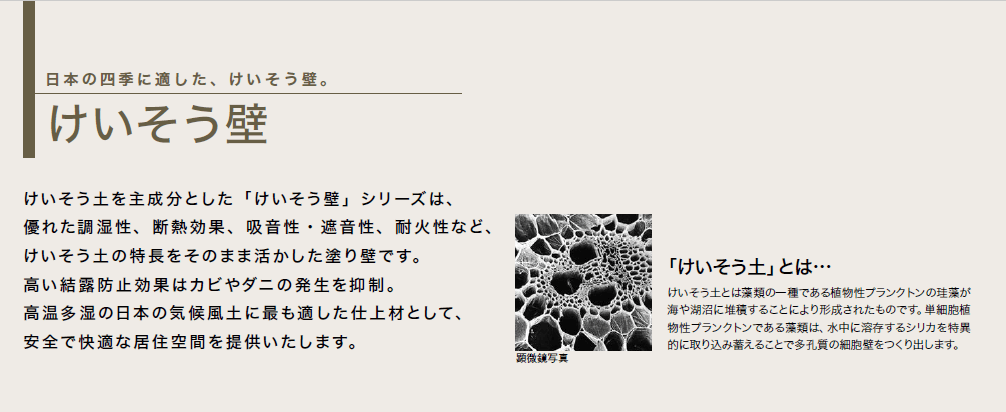 天然の土や砂を主成分とした「けいそう壁」は、無機質不燃材からなり、