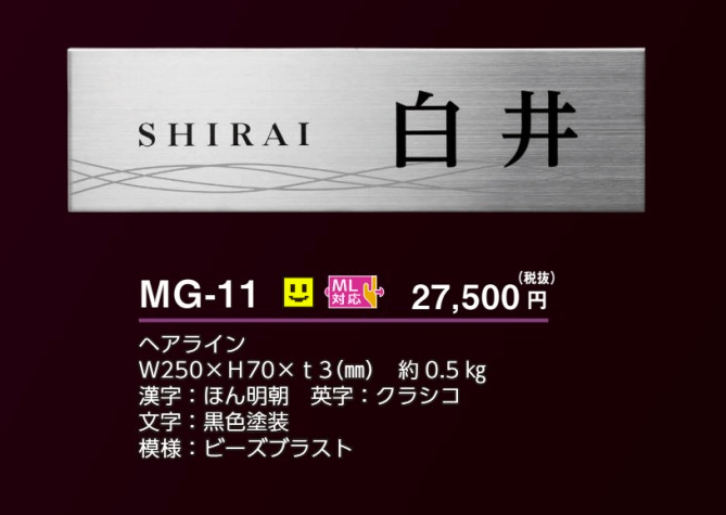 スーパーステンレス 横幅250ミリ×高さ70ミリの表札です」