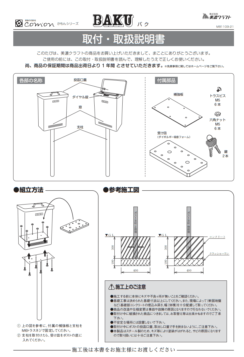 美濃クラフト BAK- バク BAKU かもんポスト デザイン(表札)付き デザイン無し [カタログ価格の30%OFF+送料無料で販売中]