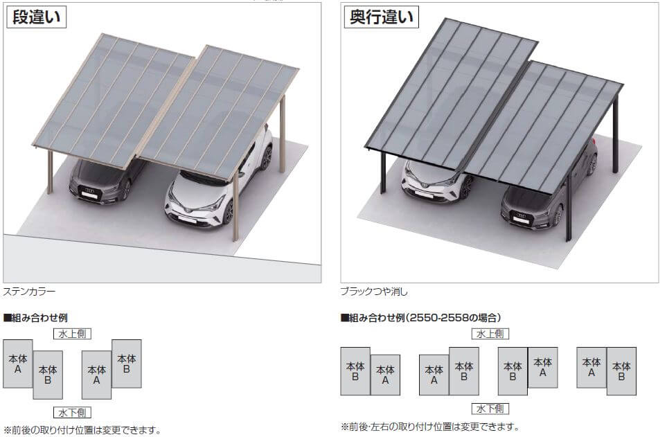 ◎敷地に合わせて、段違い、奥行きが違う場所にピッタリのカーポート。