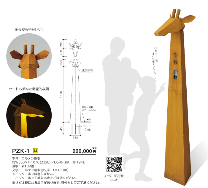 pauze PZK-1とは、キリンの形をした表札+照明+インターホンを取り付けれる機能門柱です。