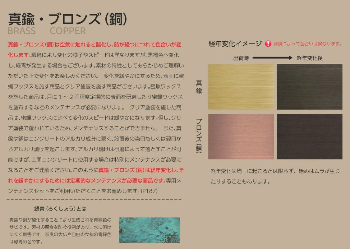 真鍮は空気に触れる事で変色する素材です。変色の進行を緩やかにしたい場は、定期的なメンテナンスをしていただく事を前提としております。
