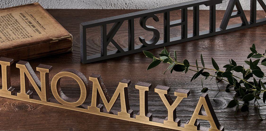 「壁の上に設置するお気型表札。暑さ10mmの真鍮切文字は存在感抜群」です。
