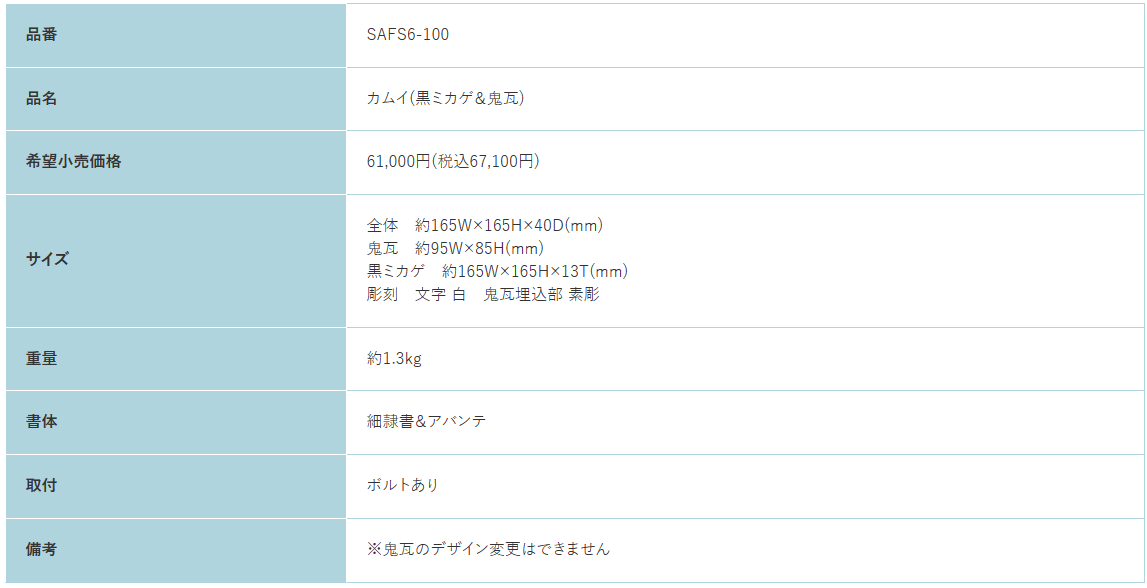 SAF6-100 KAMUI カムイ 黒ミカゲ&鬼瓦表札とは、