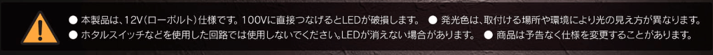 ●本製品は、12V(ローボルト)仕様です。100Vを直接つなげるとLEDが破損します。