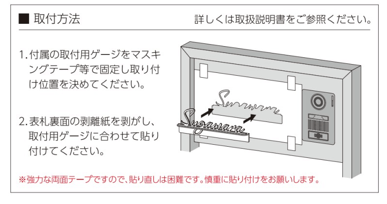 小さいステンレス切り文字表札。取り付けは両面テープです。