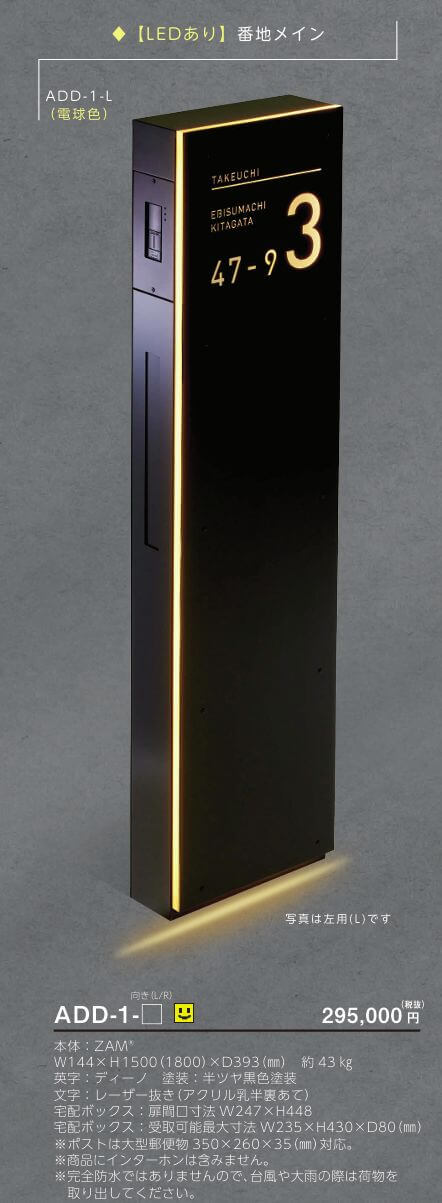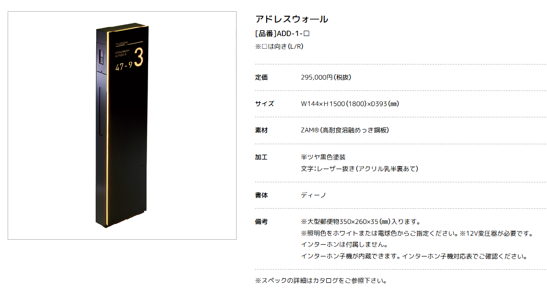 ADDRESS WALL ADD-1-は、番地メインのデザイン、住まいの“顔”となる門柱に必要な機能を集約したオールインワン型の機能門柱です。