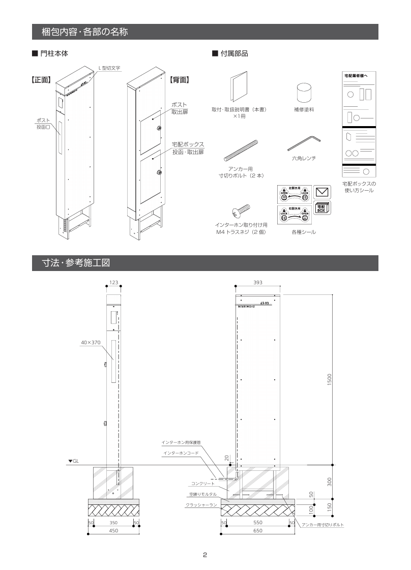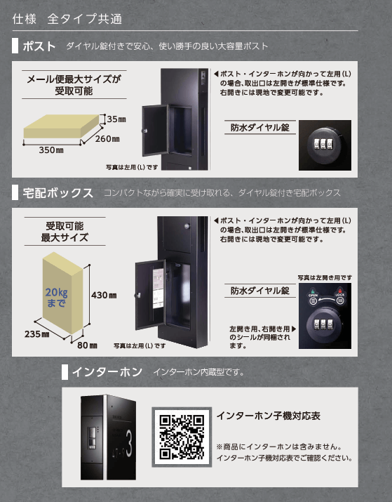 ◎一体型デザイン:表札・ポスト・宅配ボックス・インターホンを一体化し、門柱まわりがすっきり