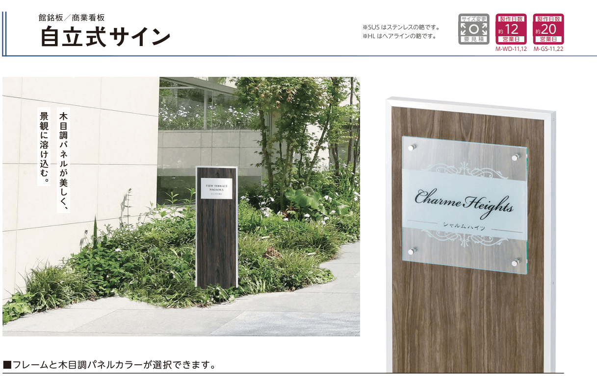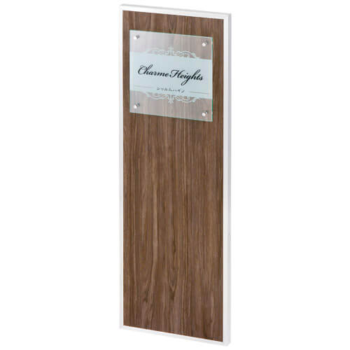 M-WD-12-とは、ステンレスと木目調パネルを組み合わせた、上質で景観に調和する館銘板です。