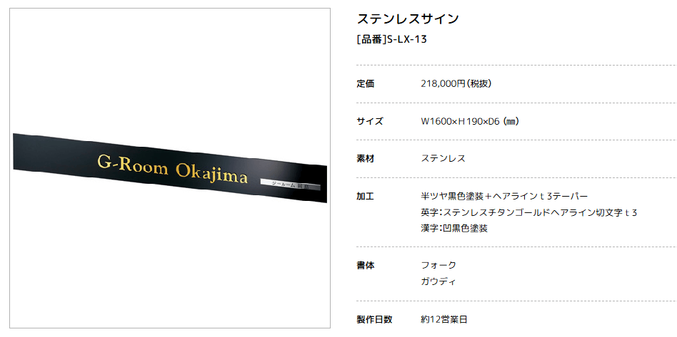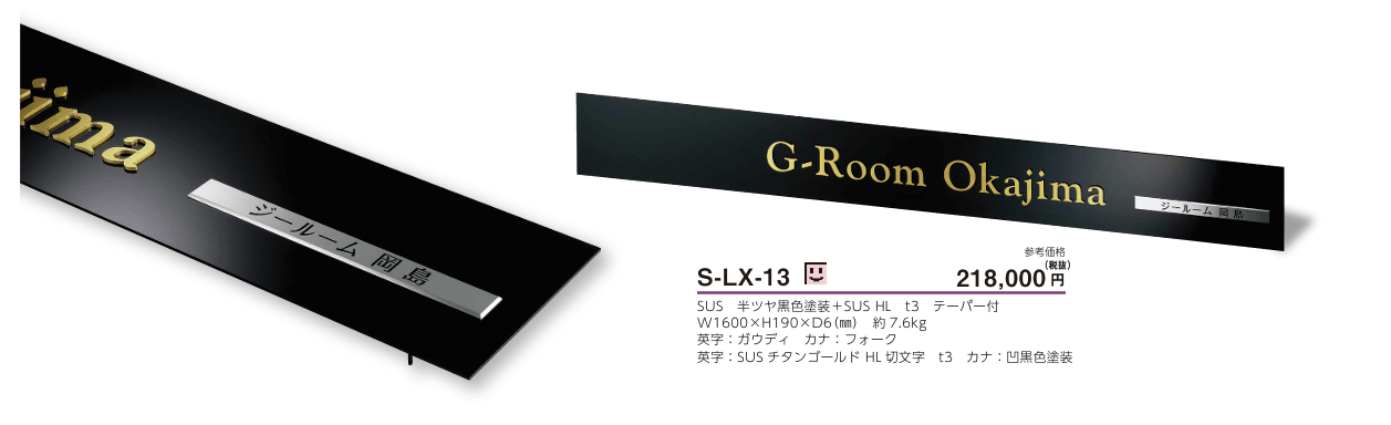 「S-LX-13」は、半ツヤ黒塗装ベースに “チタンゴールド文字” を組み合わせた高級ステンレスサイン。