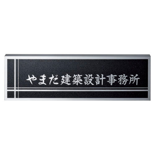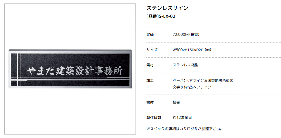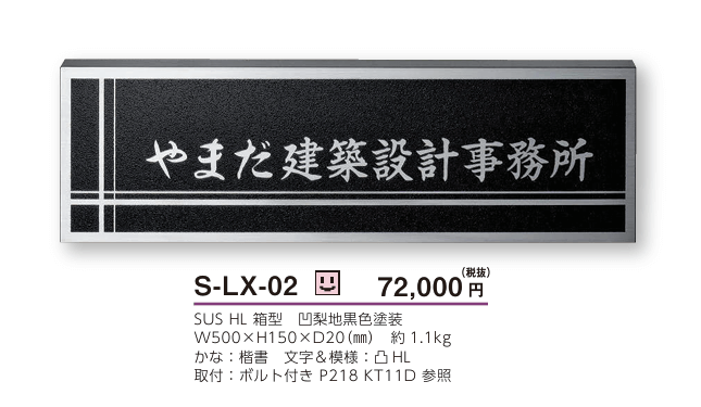 「S-LX-02」は、ヘアライン仕上げのステンレス箱型に、黒の梨地塗装を組み合わせた上質な館銘板モデル。