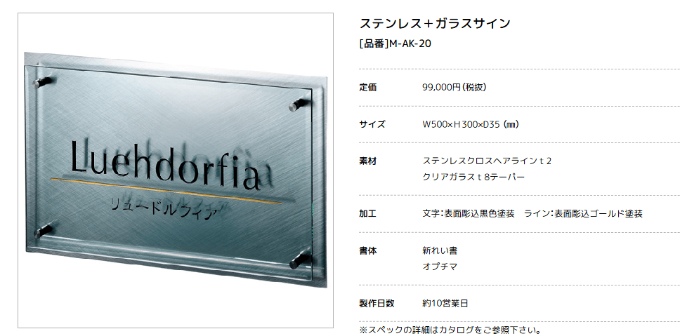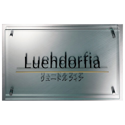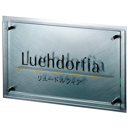 ステンレスの堅牢さとガラスの透明感を融合した、上品で視認性の高いサインプレート。